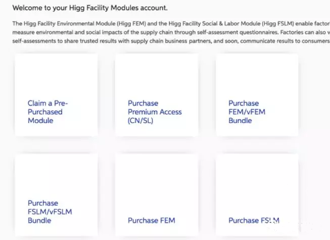 近期越来越多的企业被客户提出HIGG FEM评估的要求,相信大多数企业还是第一次接触这个标准,那么如何开展,具体如何操作呢?下面我们将从HIGG FEM评估的账号注册,模块购买,填写模块等三个方面为大家详细介绍: